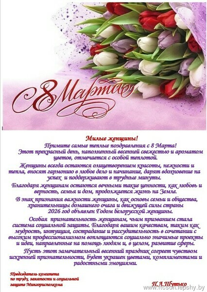 Сердечно поздравляю вас с Днем женщин! Этот праздник мы встречаем в Год белорусской женщины, и сегодняшнее 8 Марта — дань уважения вашей мудрости, силе духа и вкладу в развитие страны.